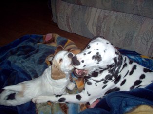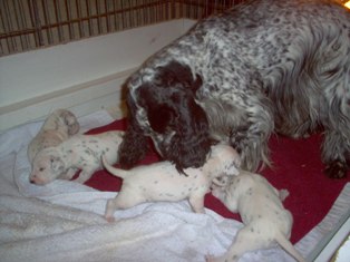 Rose watching over the Dalmatian Puppies. Does not matter who's puppies, if they needed cleaning, Rose was your girl. She was a Great Grandma and loved all puppies.